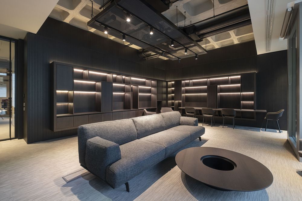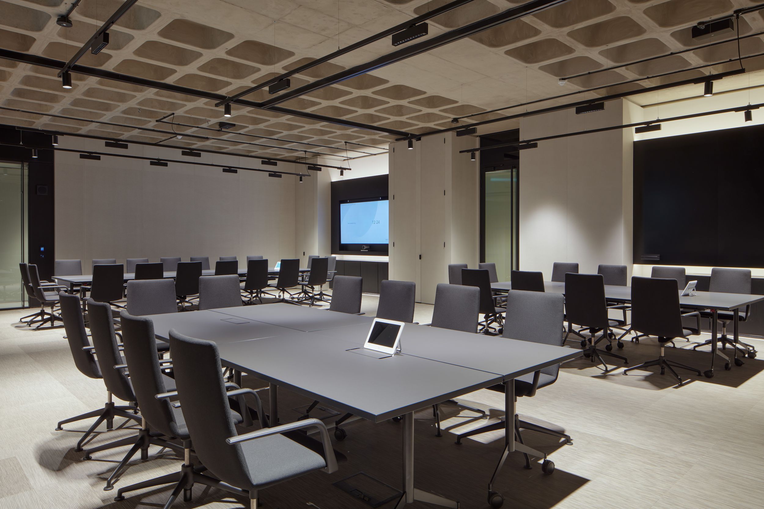 The fit out was delivered as a bespoke solution, incorporating advanced digital infrastructure, premium materials and a boutique trading floor designed with exacting precision. Early engagement enabled the team to optimise material selection, sequencing and procurement, ensuring the design vision could be achieved within the building’s structural constraints. The early strip out also allowed the restoration of the concrete waffle ceiling, sandblasted and retained as a key feature, and the exposure of services for a contemporary, industrial aesthetic. Configurable acoustic partitions form a standout conference suite, with the geometric layout meticulously planned to ensure seamless alignment throughout.