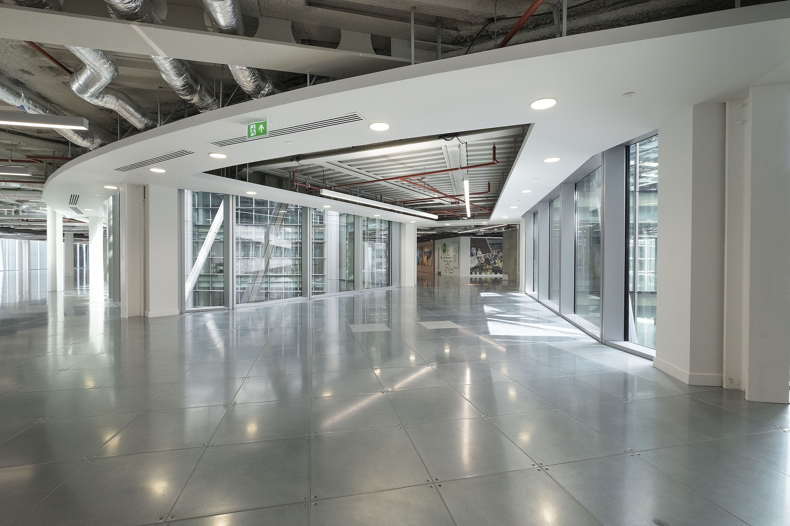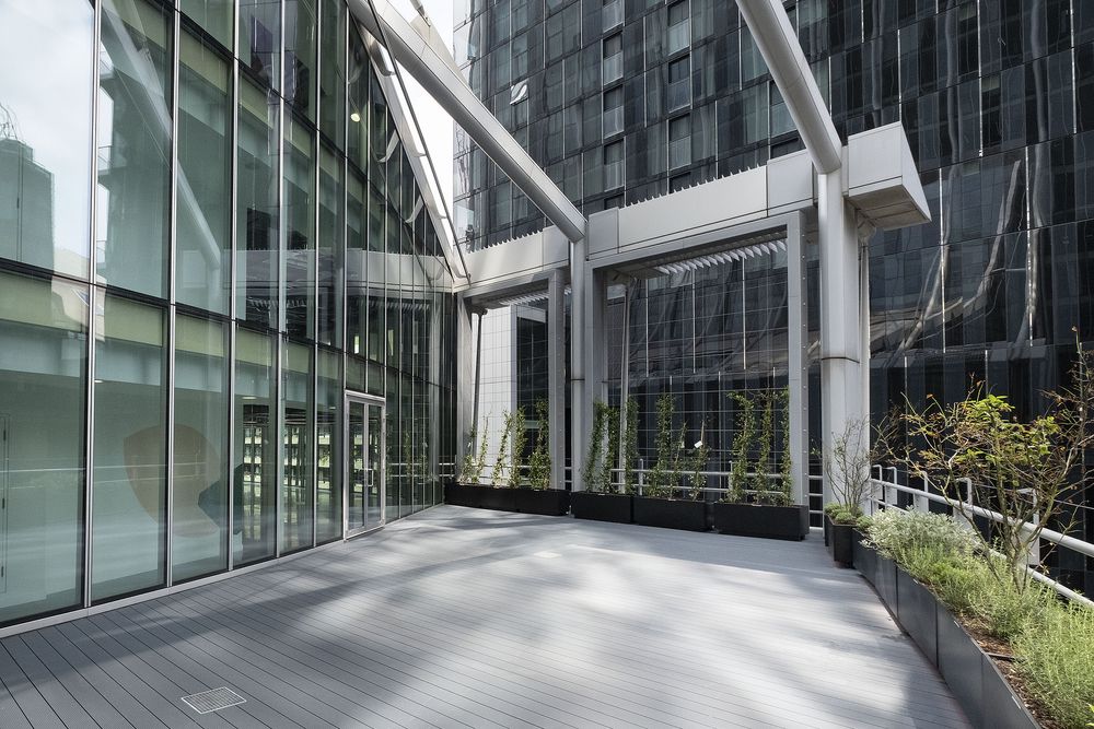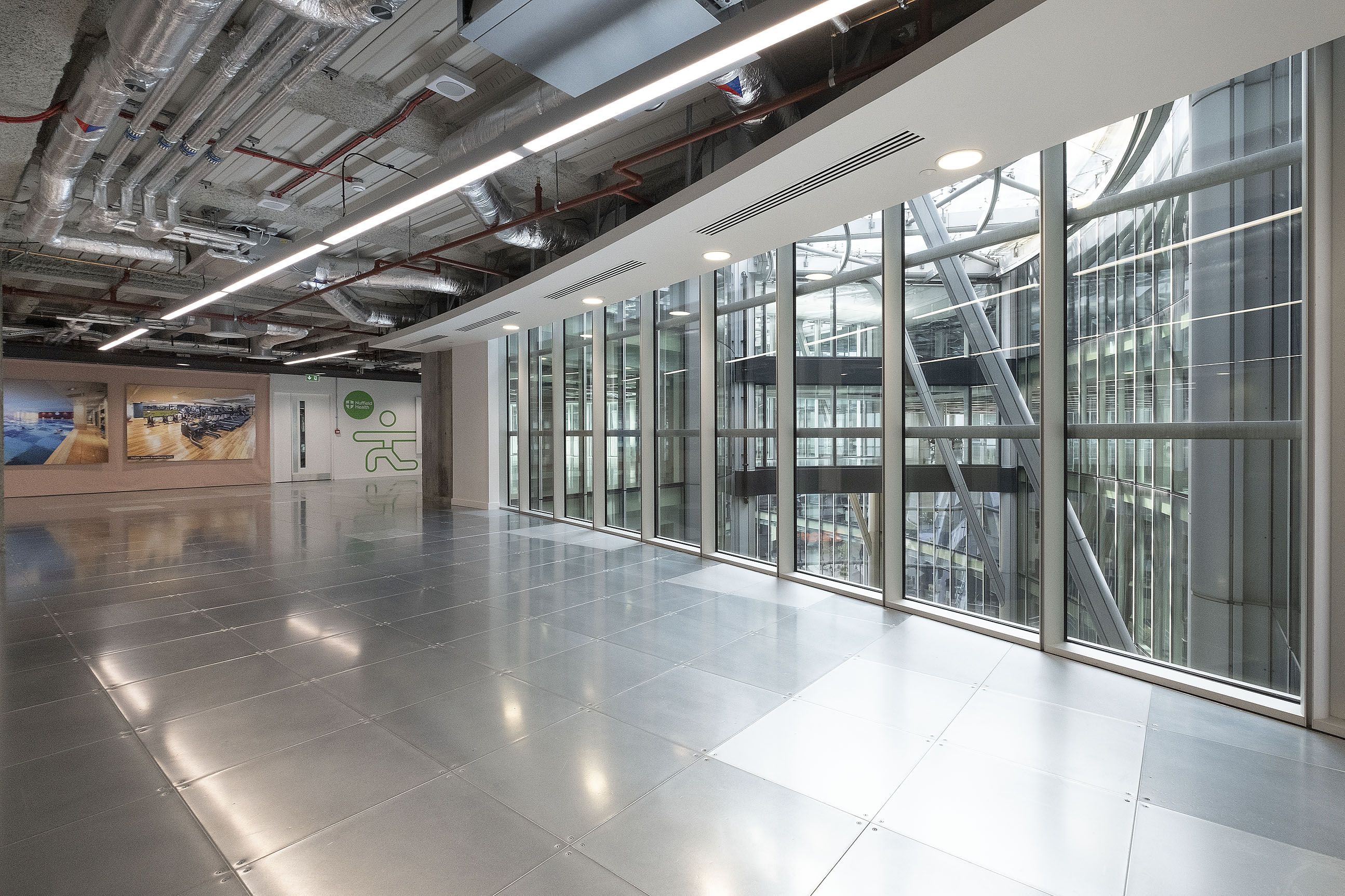 To improve circulation and unlock additional space, two multi-storey link bridges were installed to connect previously separate areas of the tower, using Davit Arms to hoist steelwork and removing sections of curtain wall glazing to facilitate installation. A third bridge created a new internal terrace at level six, with barrisol ceilings beneath each bridge maintaining natural light within the atrium. Externally, three new terraces were introduced with privacy-enhancing green walls, while 10,000 sq. ft of basement space was refurbished to provide end-of-journey facilities. Across the office floors, 12 new toilet blocks were added, delivering upgraded, flexible workspace and modern amenities throughout.