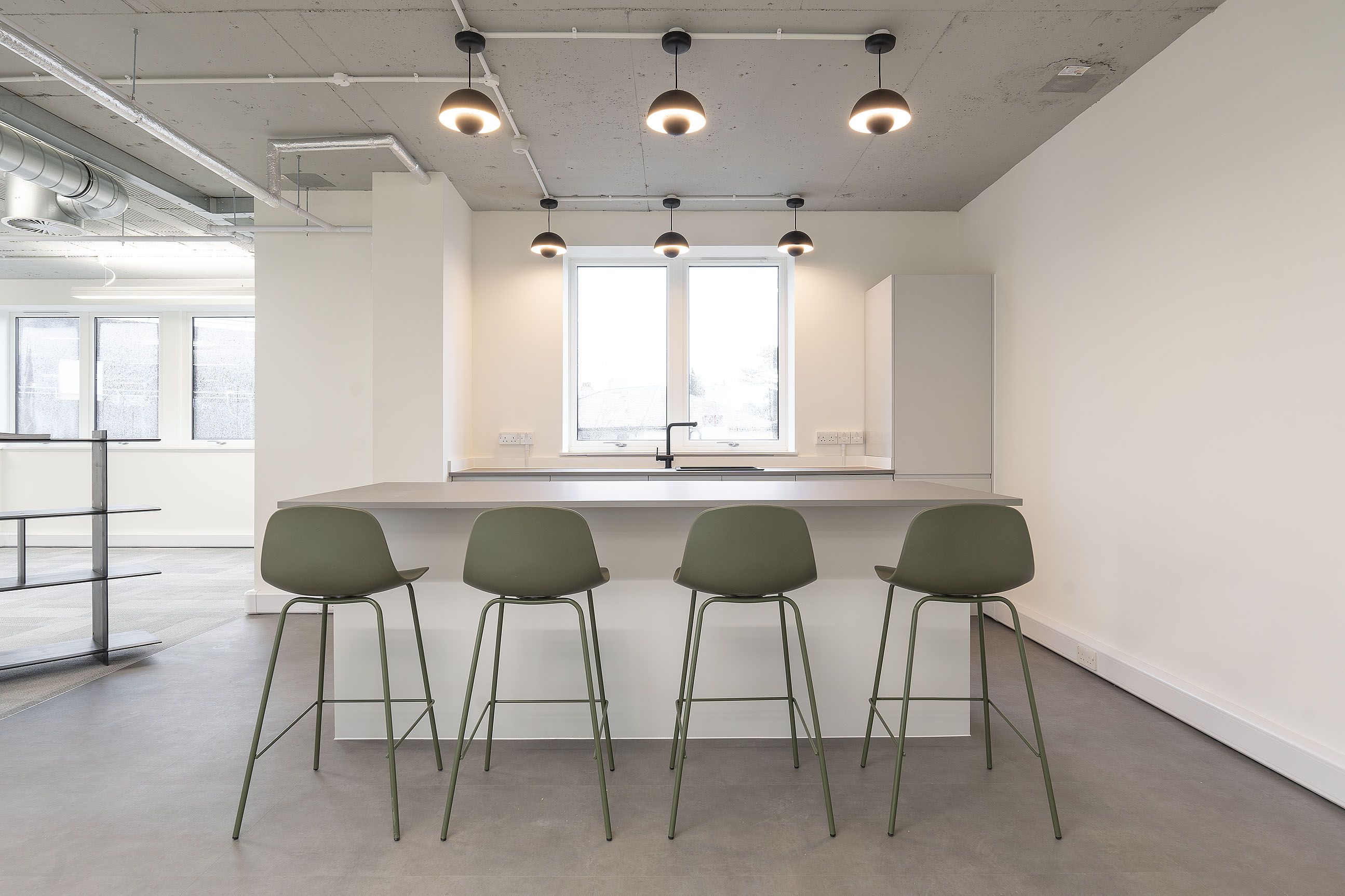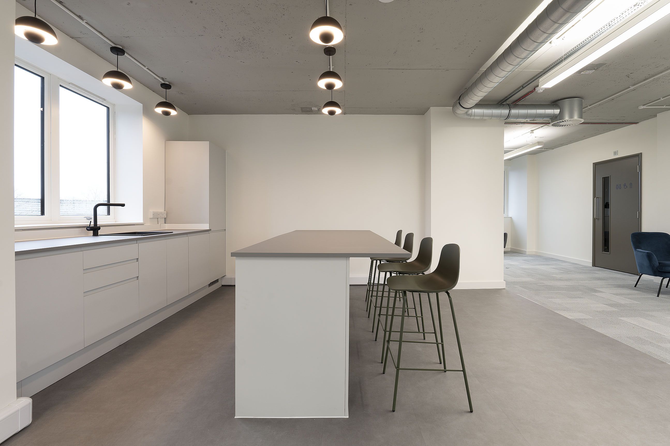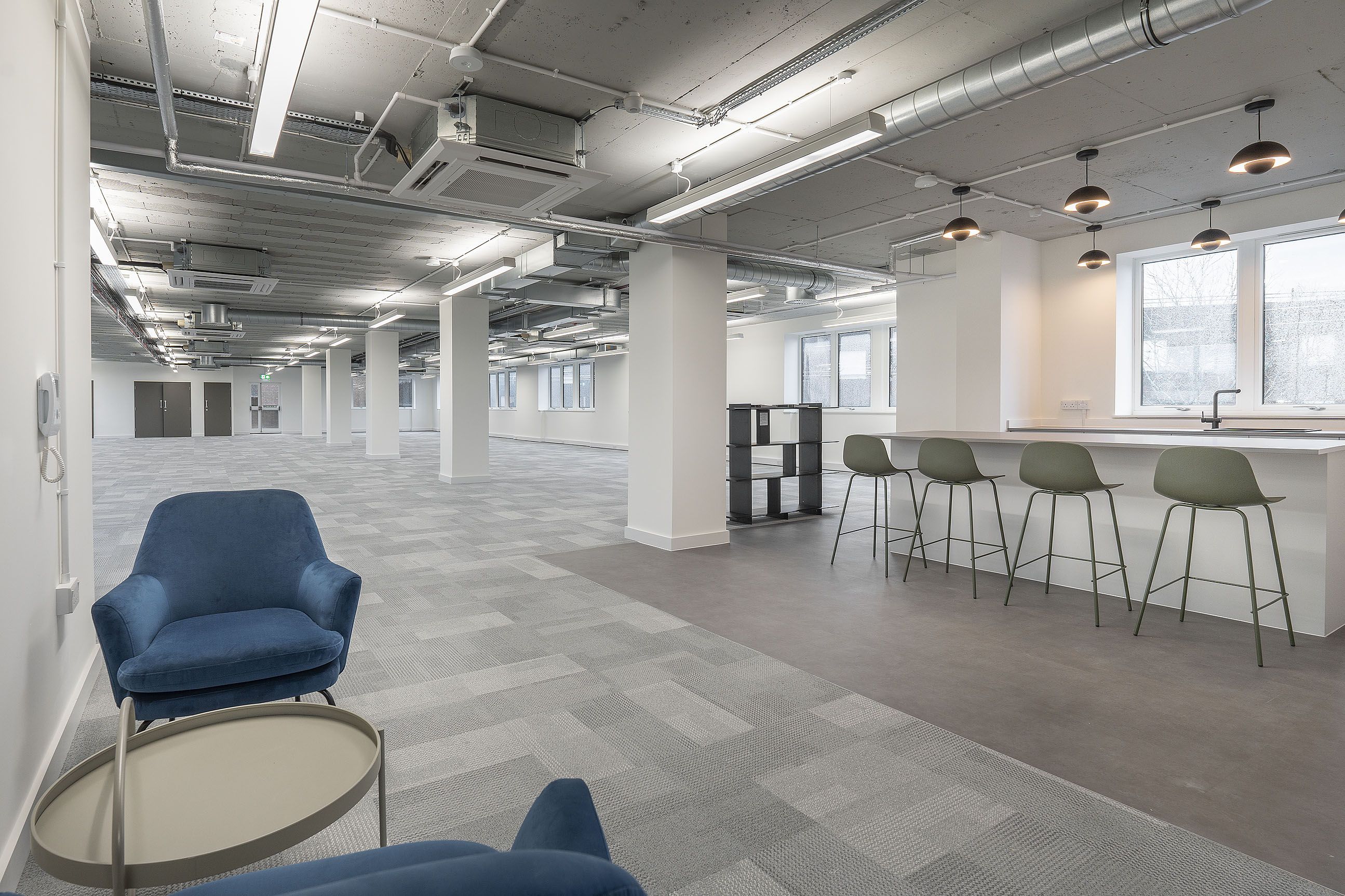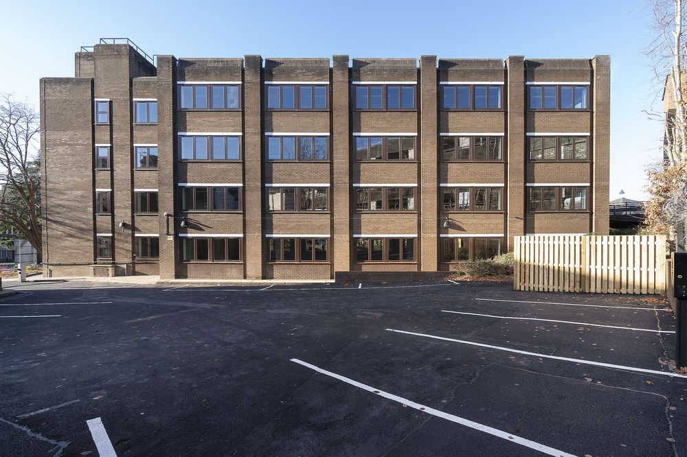 To support this, the building’s energy performance was enhanced through the introduction of exposed services, LED lighting, replacement windows and a full renewal of the roof covering. Alongside these upgrades, new tea points, DDA-compliant WCs and showers were delivered on every floor, with a new entrance and access system improving arrival and accessibility. Externally, the car park was refurbished and landscaped to provide additional parking, rationalised circulation and on-site EV charging, creating a modern, efficient and flexible workspace.