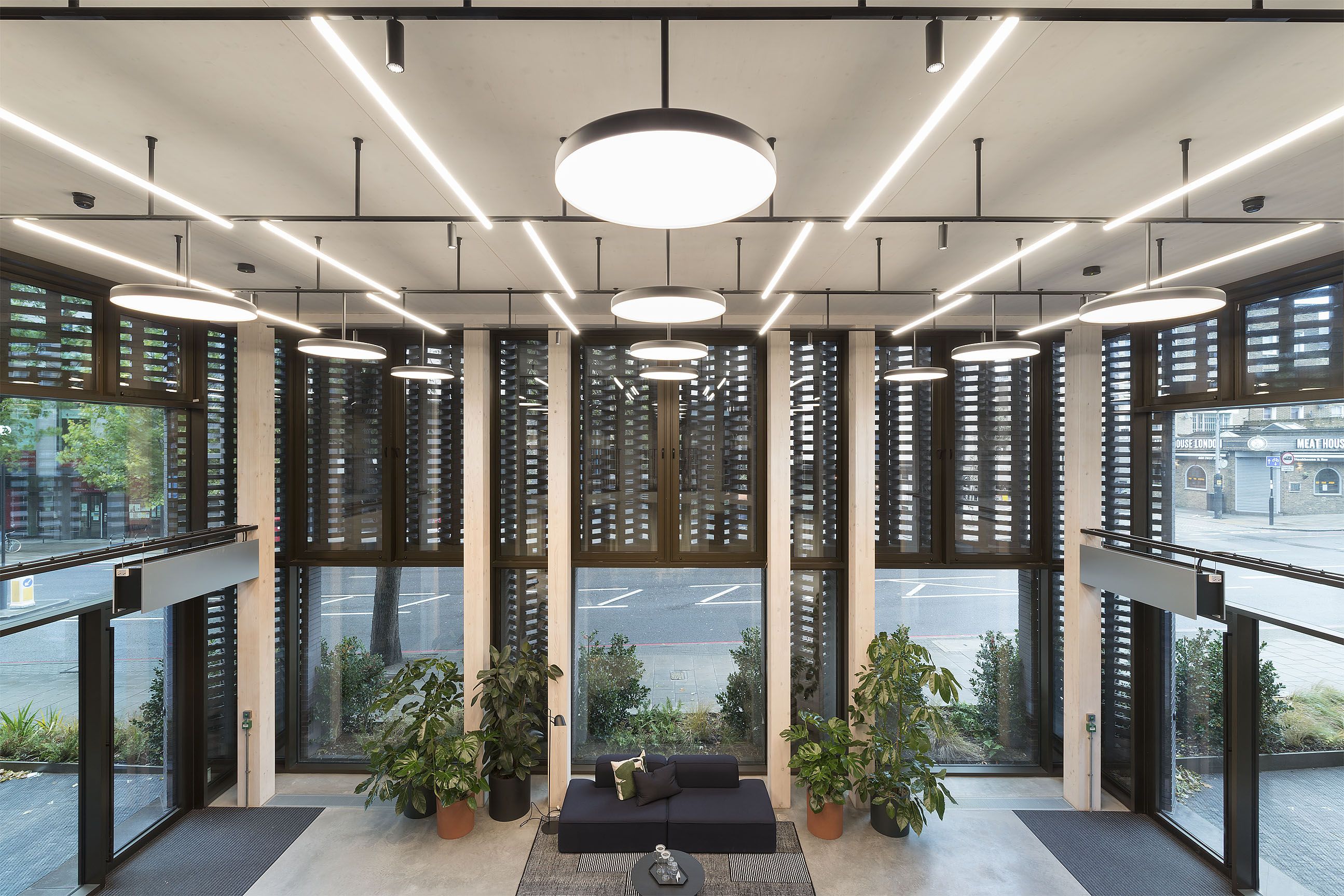 The project introduced a new five‑storey entrance building with a double‑height arrival space, offices above and a set‑back roof extension with terrace. A ground‑floor extension connects landscaped gardens to a generous coworking lounge, café and meeting spaces, while interiors expose original concrete and new cross‑laminated timber structure. A defining feature is the structurally self‑supporting perforated brick lattice façade, concealing a timber frame and operable windows. The result is a distinctive, sustainable workspace that balances architectural character with modern functionality.