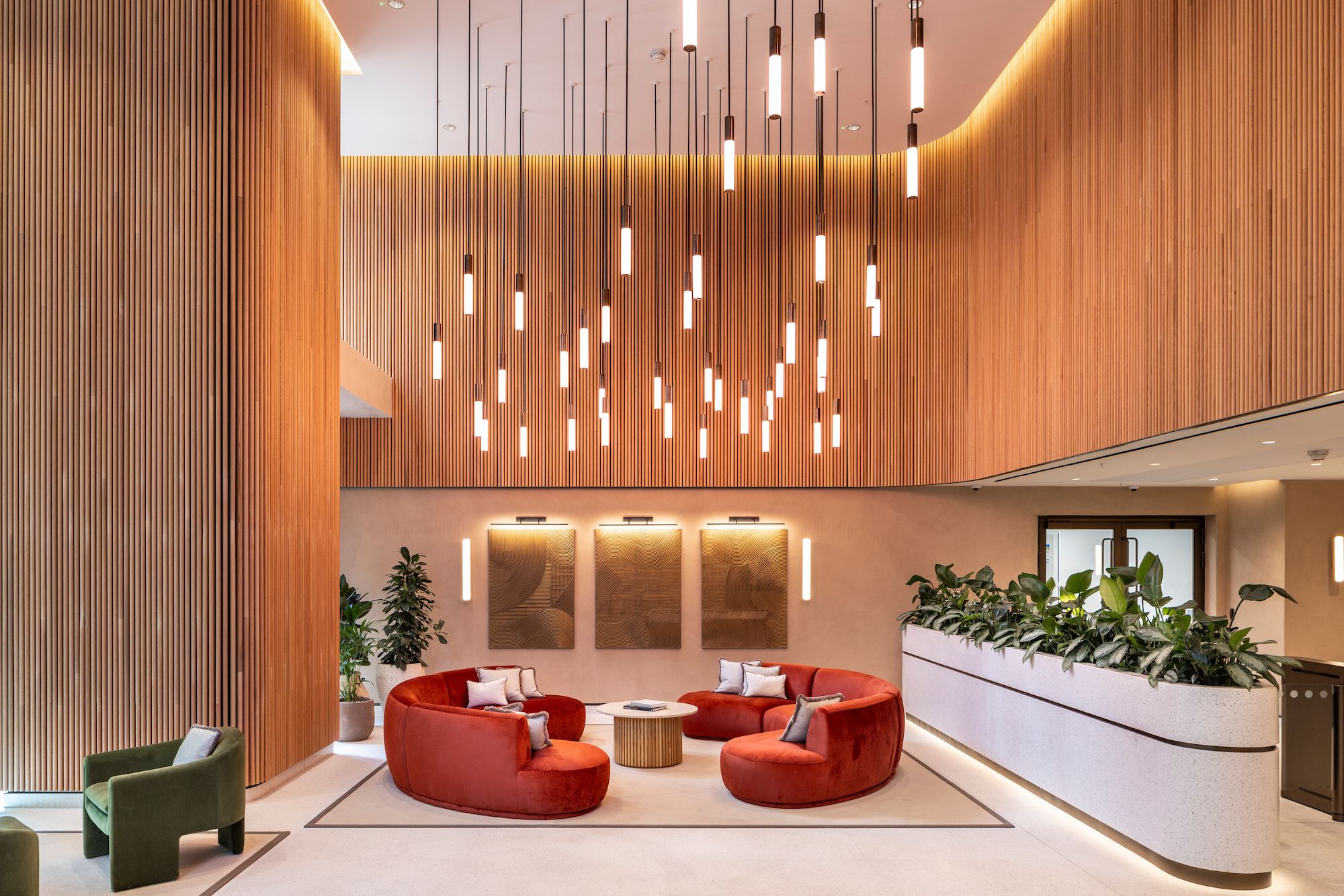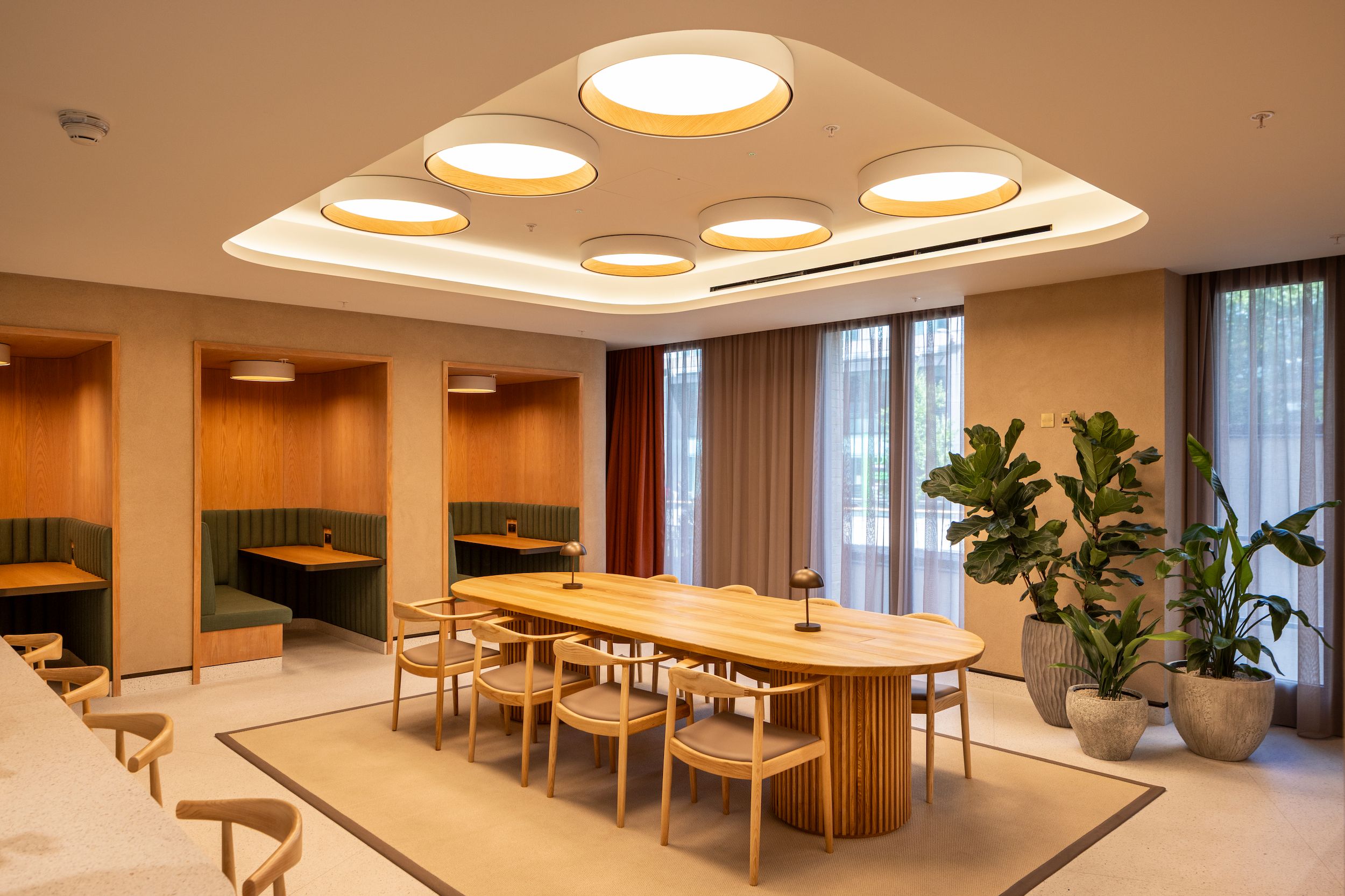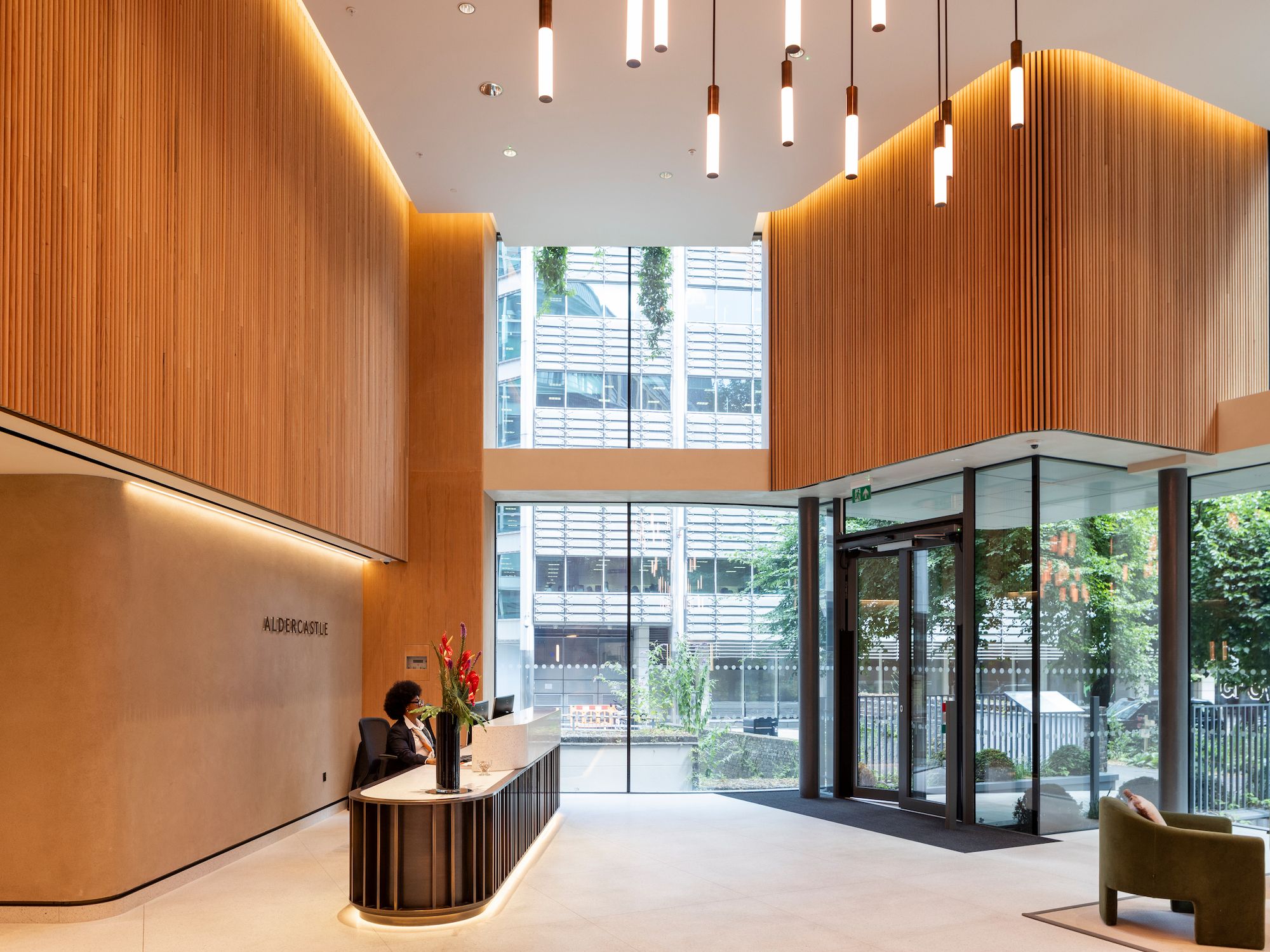 We transformed Alder Castle into a contemporary workspace and co-working destination with three new outdoor terraces and a reimagined double-height reception. The project involved the full removal of the building’s original glazed façade and the construction of an extended entrance formed with curved, frameless curtain walling, creating a striking new arrival experience. Inside, carefully detailed Cat A and Cat B refurbishments introduce warm materiality, improved natural light, and elevated finishes throughout. The result is a bright, modern workplace that pairs refined design with enhanced functionality and long-term building performance.
