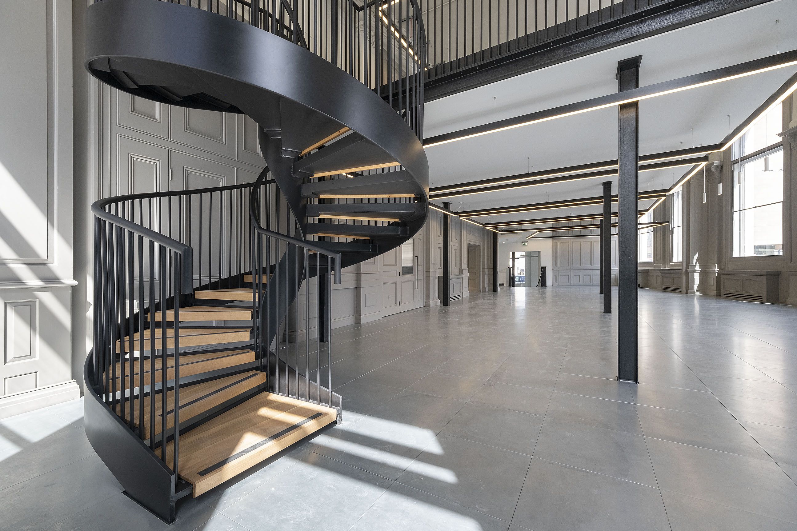 Within the double-height former banking hall, a new steel mezzanine and helical staircase increase lettable area while complementing restored timber panelling and original architectural detail. The basement vaults have been repurposed into high-quality end-of-journey facilities, retaining the original Chubb doors as striking historic features.