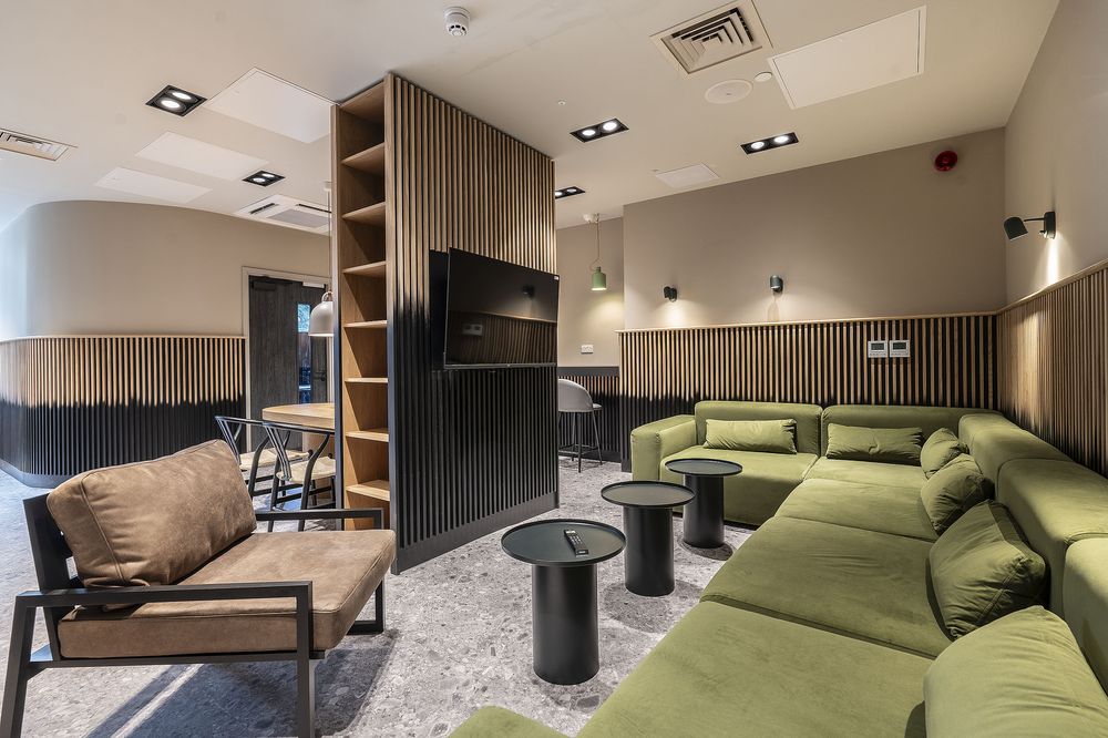 The project involved significant remediation works after strip‑out revealed widespread issues with fire safety, ventilation and existing services. The building was fully reclad and wrapped in scaffold—installed over nine months—to enable intrusive repairs, including cutting into structural beams and bedroom spaces to secure the new façade. Alongside these essential upgrades, the team completed the full fit out of bedrooms and amenity areas, adding new recreational spaces, a gym, café, private dining rooms and renewed reception zones. Together, these interventions deliver a safe, modern and experience‑led environment that sets a new benchmark for the operator.