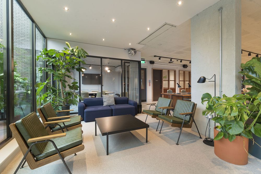 The project introduced a new five‑storey entrance building with a double‑height arrival space, offices above and a set‑back roof extension with terrace. A ground‑floor extension connects landscaped gardens to a generous coworking lounge, café and meeting spaces, while interiors expose original concrete and new cross‑laminated timber structure. A defining feature is the structurally self‑supporting perforated brick lattice façade, concealing a timber frame and operable windows. The result is a distinctive, sustainable workspace that balances architectural character with modern functionality.